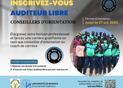 Le Département d’Informatique de l’École Normale Normale Supérieure de l’Université de Maroua prépare les étudiants au métier d’enseignant d’informatique pour le secondaire. Les enseignements d’Informatique ont démarré en 2008. Le département n’a cessé́ de se développer et de s’améliorer : nos programmes combinent à la fois les principes de l’éducation classique et les technologies modernes qui sont en phase avec les changements dans le monde entier.
